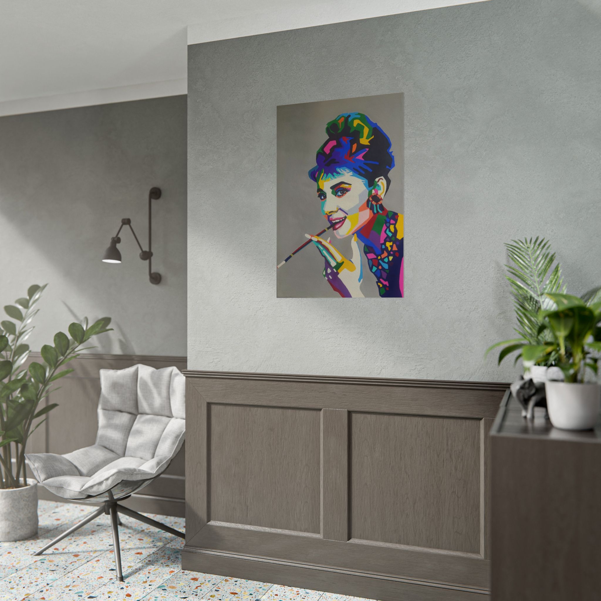 Bring bold color and classic elegance into your space with this stunning WPAP-style pop art portrait. Bursting with rich, geometric color blocks and modern abstract detailing, this artwork reimagines a timeless vintage icon with a fresh, contemporary twist. Breakfast at Tiffany’s reimagined!